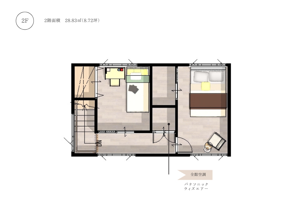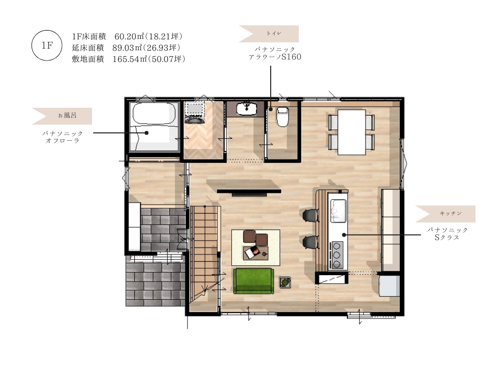 【PLAN DATA】 1階床面積 60.20㎡(18.21坪) 2階床面積 28.83㎡(8.72坪) 延床面積 89.03㎡(26.93坪) 敷地全体面積 165.54㎡(50.07坪)