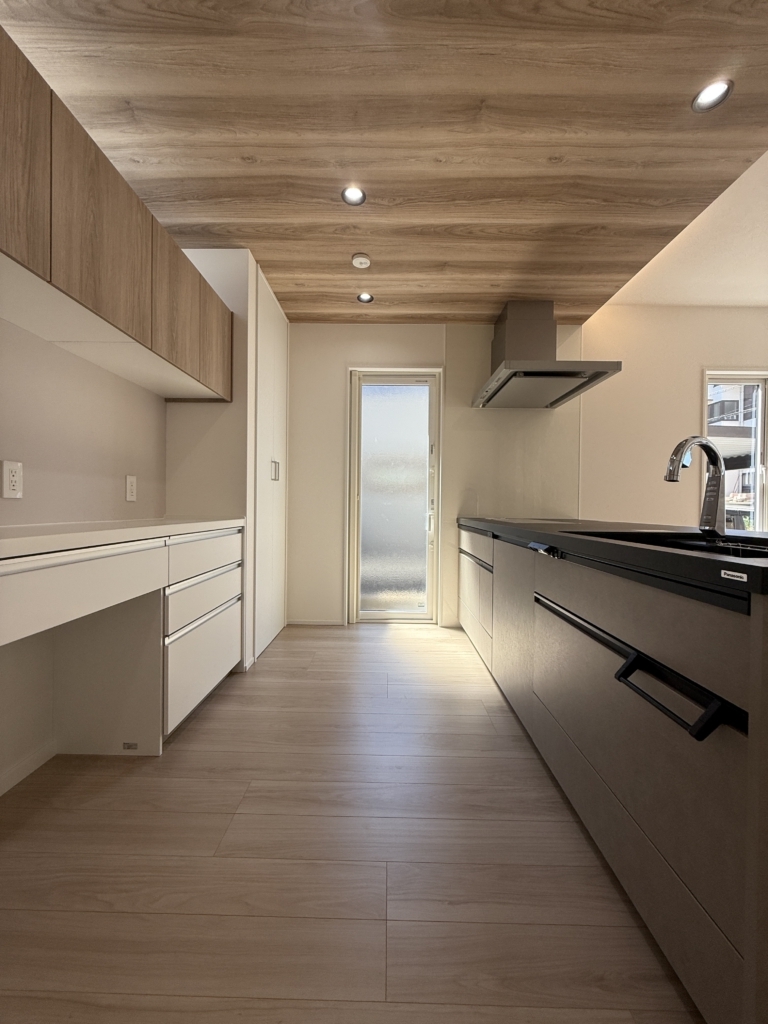 木目とグレー・ブラックを基調としたLDKは、パナソニックLクラスのフルフラット対面キッチンを中心に、上質で落ち着いた雰囲気に。