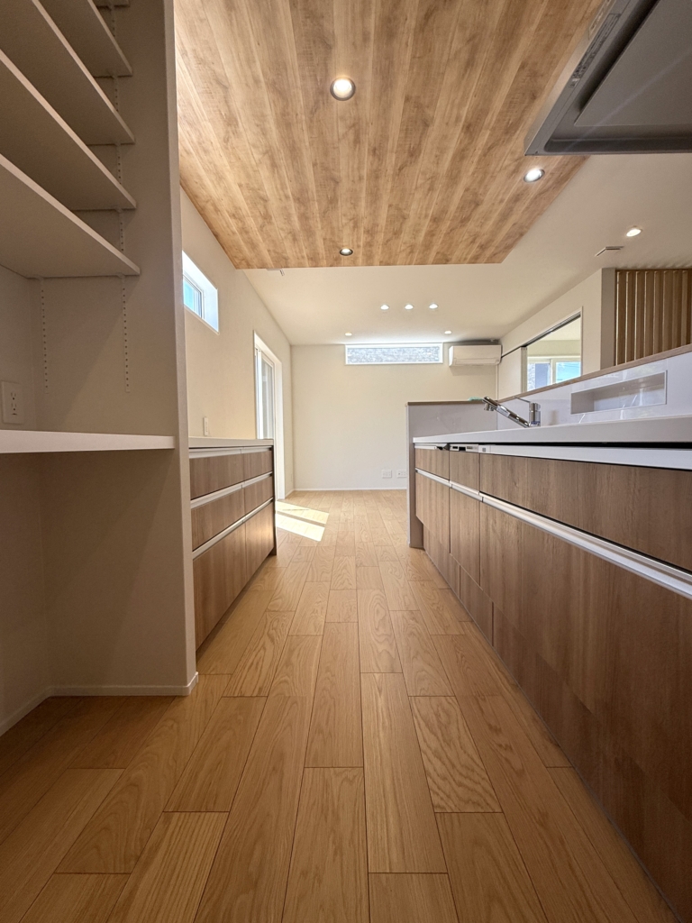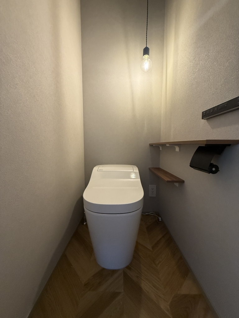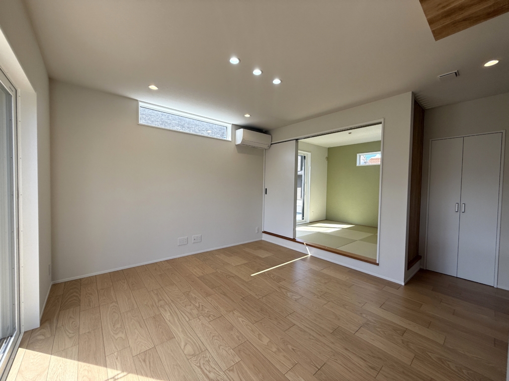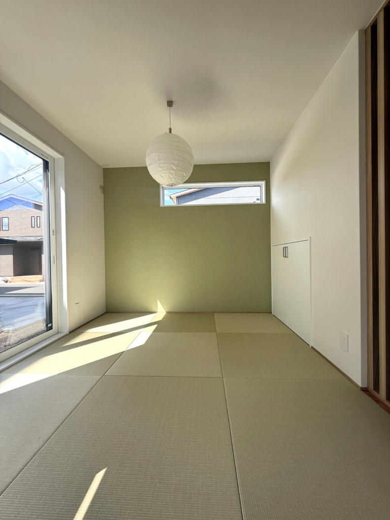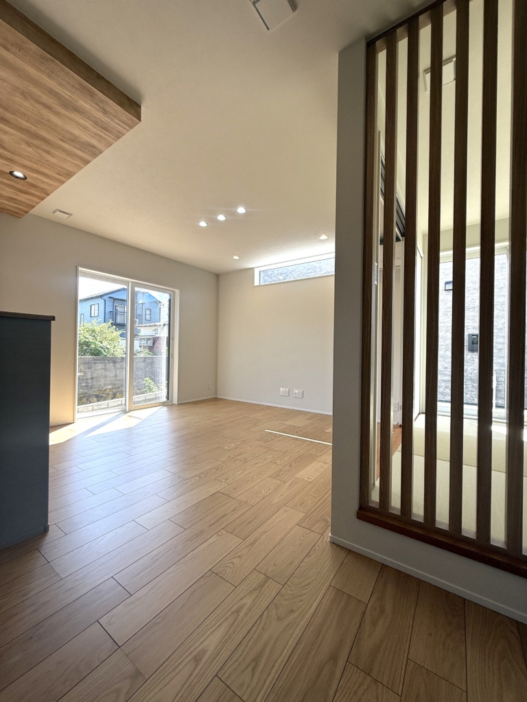 日本の伝統美と北欧のシンプルさが融合した「ジャパンディ」スタイルの住まい。 落ち着いたアースカラーと自然素材の質感を生かした空間には、和室の格子が美しく映え、心安らぐ住まいを実現。